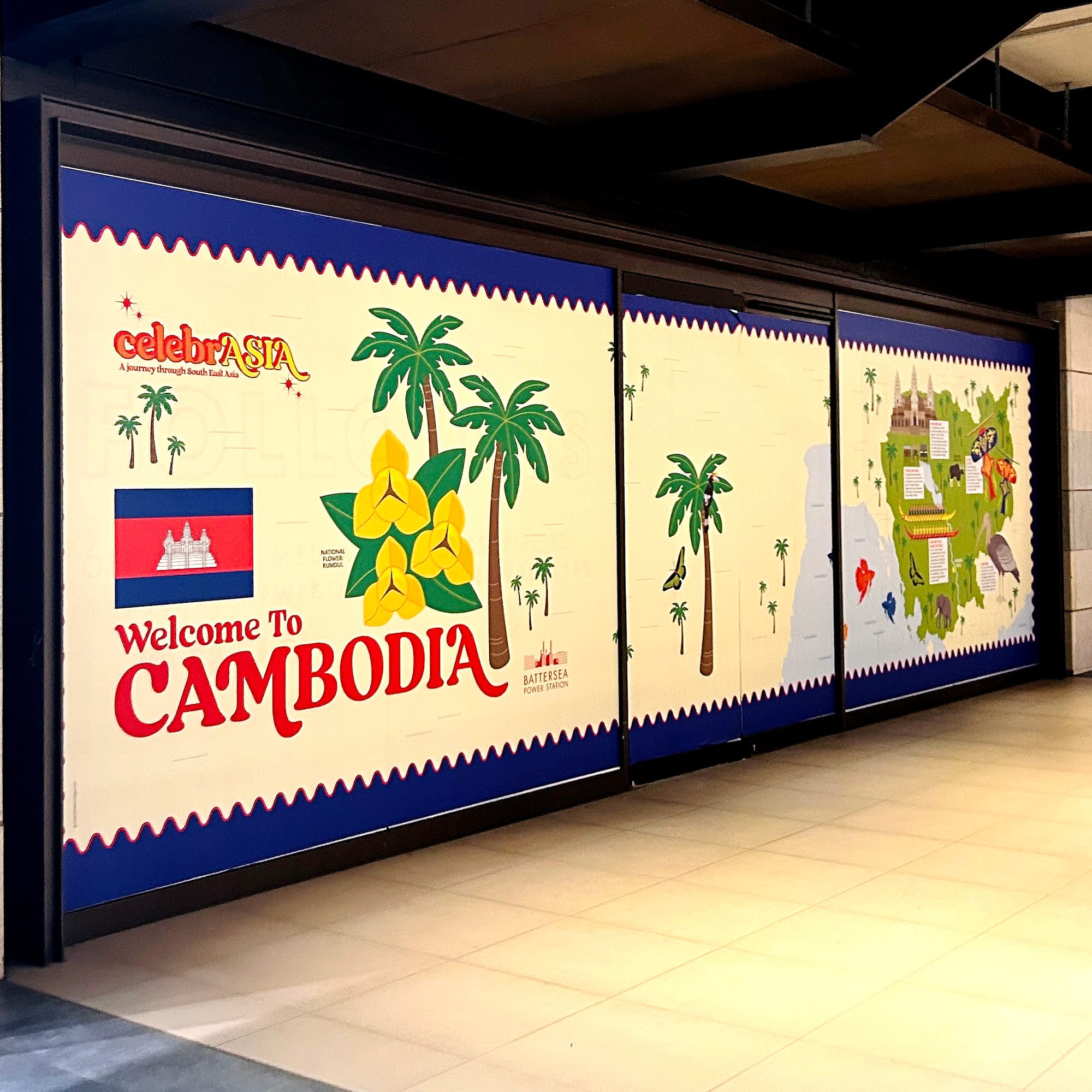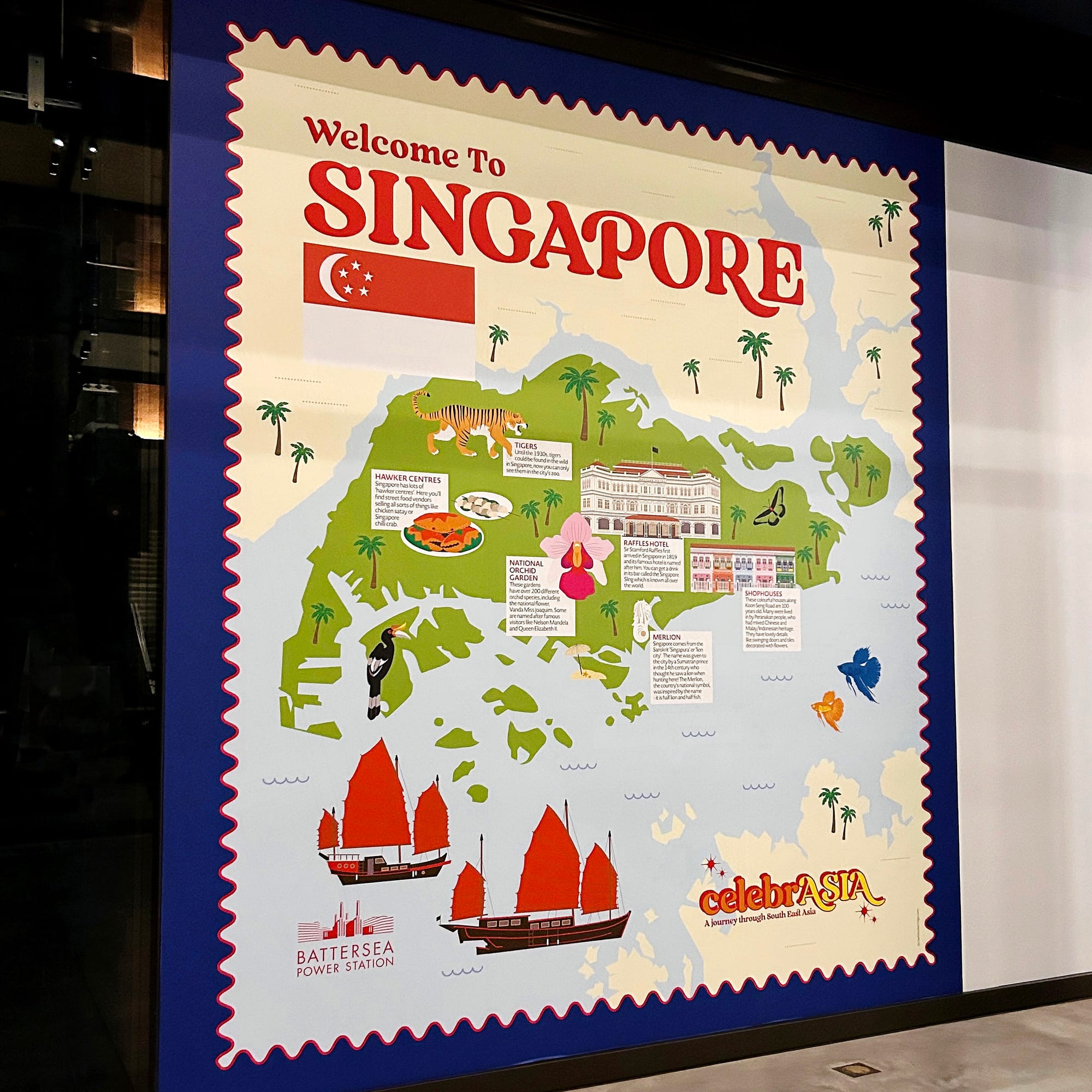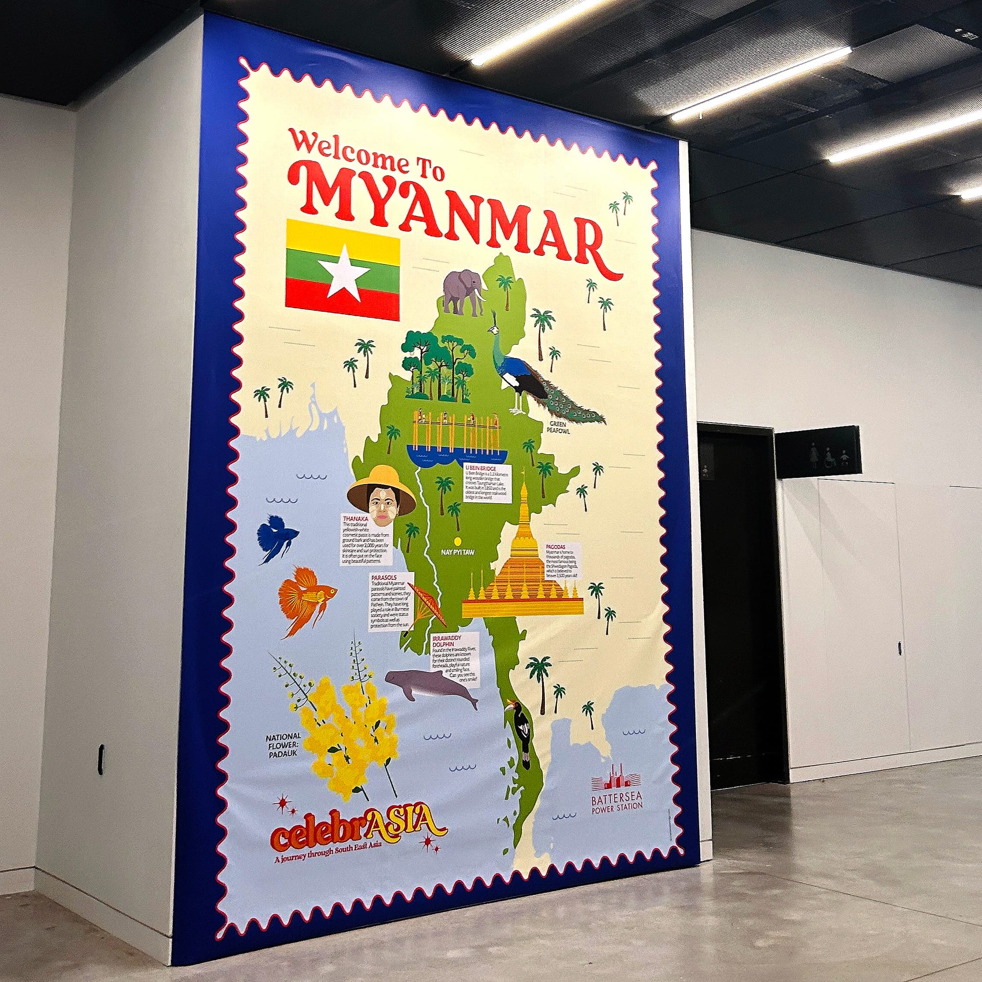 There’s a lovely Ealing connection to this project. Kate McKenzie, founder of the much-missed "Store Collective" in Ealing (now relocated to Margate), organises festivals and was working on celebrASIA, an event created by Battersea Power Station to celebrate the rich culture and heritage of South East Asia. She knew my illustrations of Ealing parks and landmarks well from our previous collaborations, so she had my style in mind when pitching the idea of large format illustrated maps to create a “Grand Tour of South East Asia” inside the Power Station. This is how I ended up being commissioned to produce the final massive artworks for the festival.